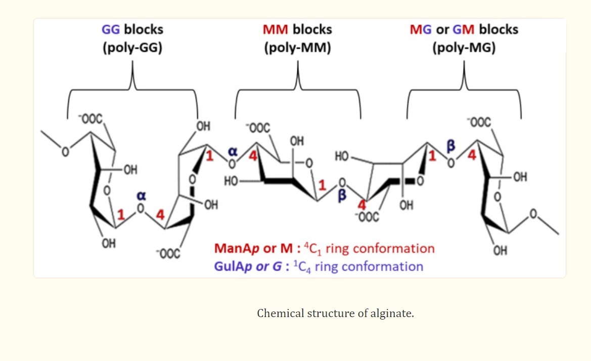 Alginate, also called alginic acid is a hydrocolloid from algae, specifically brown algae, which is a group that includes many of the seaweeds, like kelps and an extracellular polymer of some bacteria. Sodium alginate is one of the best-known members of the hydrogel group. The hydrogel is a water-swollen and cross-linked polymeric network produced by the simple reaction of one or more monomers. The main structure of alginates is composed of two monomeric units: β-(1,4) linked d-mannuronic acid (ManAp or M) with 4C1 ring conformation and α-(1,4)-linked l-guluronic acid (GulAp or G) with 1C4 ring conformation.
